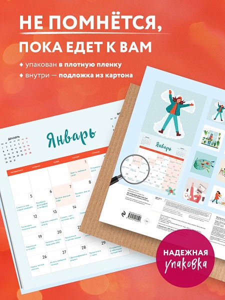 Настенный календарь на 2026 год с яркими иллюстрациями! В каждой ячейке календарной сетки предлагается уникальный повод для счастья: прогулка в парке, встреча с друзьями, букет цветов в подарок себе самой. Идеальный подарок всем, кто мечтает научиться замечать каждый день.