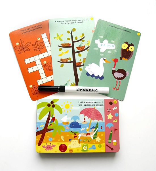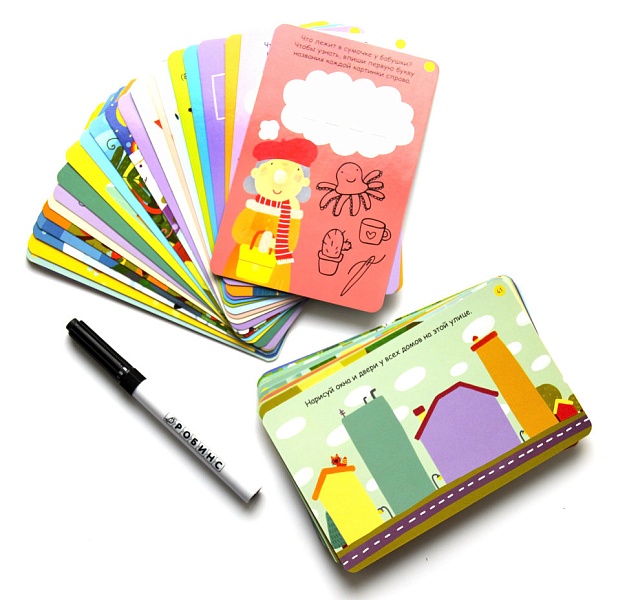 В набор входят 50 двусторонних многоразовых карточек с методически проработанными заданиями для тренировки мозга дошкольника.