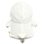На малыше Басике милый комбинезончик с капюшоном в виде Гусика. Комбинезон сшит из тактильно приятного меха с коротким ворсом белого цвета, с вышитыми глазками и клювиком Гусика из охристого софта на капюшоне.