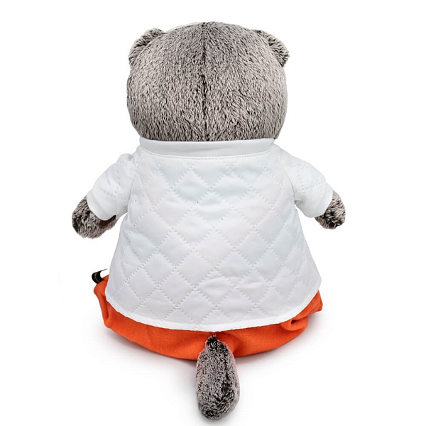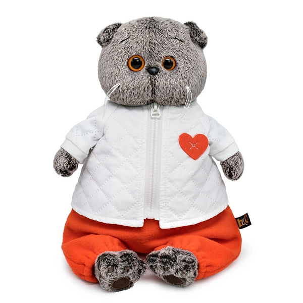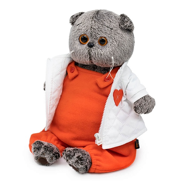 Кот Басик в невероятно стильном комплекте. Белоснежная курточка на молнии, сшитая из болоньи со стёганным эффектом. Курточку украшает милое оранжевое сердечко из фетра. В комплекте уютный ярко‑оранжевый комбинезон из мягкого флиса, сшитый на лямочках с пуговками и резиночками по низу штанин.