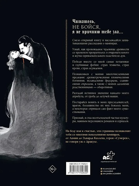 Вместе мы победим самые глубинные страхи: боязнь темноты, ужас перед кровью, страх быть отвергнутым обществом. На страницах этой книги ты познакомишься с моими многочисленными предками — от древнегреческих хтонических богинь до исландских драугров и славянских стрыг. Узнаешь о моих дальних родственниках-оборотнях и поймешь истинное значение каждого моего атрибута — от гроба до летучей мыши.