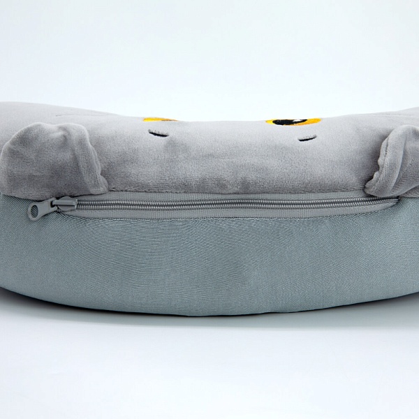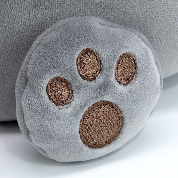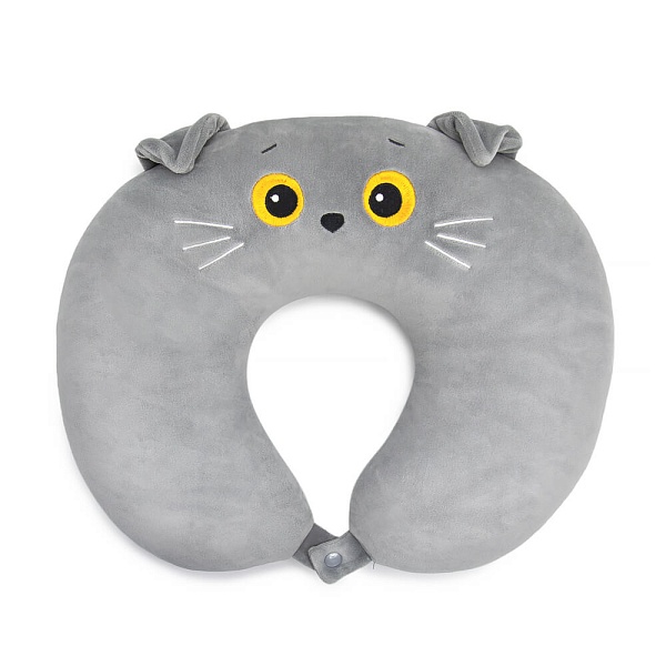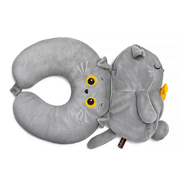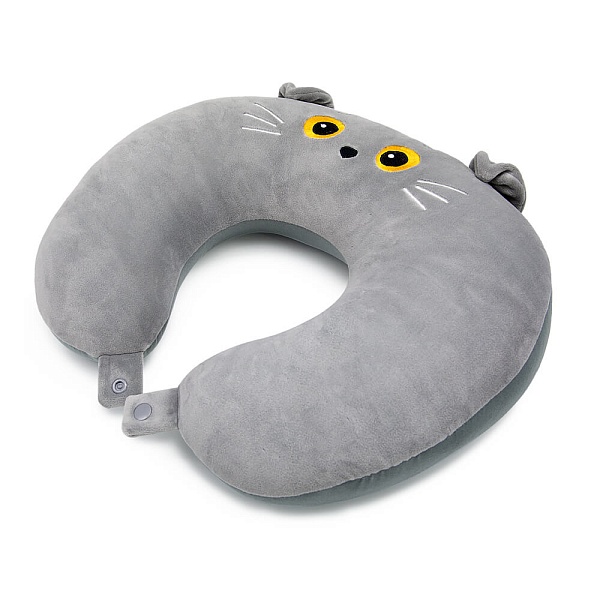 Очень необычная, но очень удобная подушка Басик, сшитая из серого спандекса. Подушка с вышитой мордочкой Басика предназначена для удобства в поездках и полётах на самолёте. Хорошо ложится на шею и застёгивается на кнопку спереди. Такая подушка легко убирается в кота-игрушку. На спине кота-игрушки вшита зип-молния, чтобы удобно было убирать и доставать нашейную подушку. У кота-игрушки спящие глазки, фирменный галстук бабочка и петелька с кнопкой сверху. Петелька служит для того, чтобы удобно было закрепить подушку-игрушку, например, на сумке.