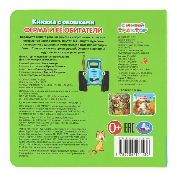 Малыш с удовольствием будет рассматривать яркие страницы с изображениями весёлого Синего Трактора и забавных животных, обитающих на ферме, выполнять увлекательные задания и открывать секретные окошки, чтобы найти правильный ответ. Книжка сделана из плотного картона, поэтому мамы могут не опасаться, что ребёнок порвёт странички.
