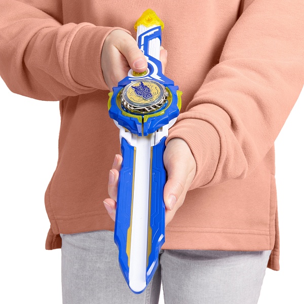 Он помогает точнее запустить блейд на арену. Меч не только пусковая установка, но и монтажный инструмент. Используй облегченный волчок для скоростного запуска. Его можно пересобирать: все элементы взаимозаменяемы внутри линейки Эпик Лончер. В наборе ты найдешь дополнительный аватар Надо. Вставь Надо в специальное отверстие до щелчка, раскрути волчок с помощью ножен, нажми кнопку запуска.