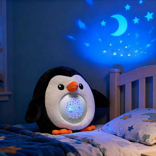 Мягкая музыкальная игрушка с проектором. Имеет световые и звуковые эффекты: воспроизводит 20 приятных мелодий и проекцию ночного звездного неба изменяя 5 цветов света .Игрушка непрерывно работает в течение 20 минут. Можно стирать, предварительно вынув музыкальный блок. Высота игрушки 18 см