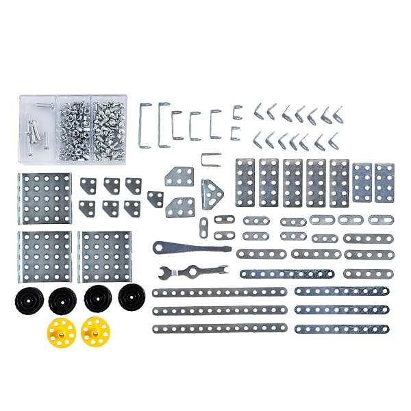 Металлические детали имеют размер от 2 до 15 см, толщина металла составляет 0,8 мм. Расстояние между центрами отверстий – 10 мм. Крепёж имеет резьбу М4.