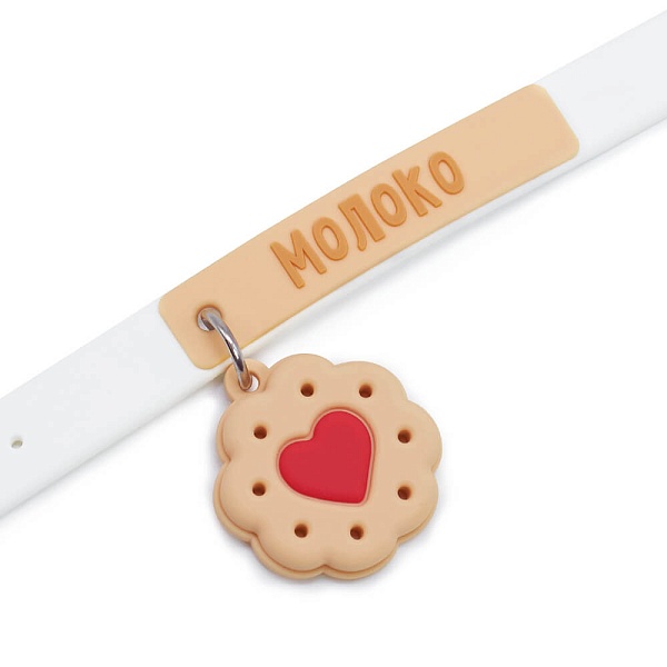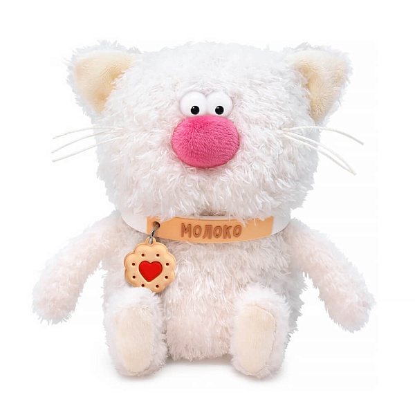 Милый котёнок Молоко из тактильно приятного эко меха молочного цвета. Лапки и хвостик из более короткого меха. Усики из шелковистого крученого шнура. Объемный носик обтянут розовым софтом. Глазки из пластика. На пяточках и внутри ушек вшит сливочный софт. На шейке у котёнка силиконовый чокер с именем и подвесом в виде печенья с розовым сердечком. Чокер легко снимается и может послужить в качестве модного браслета для друга.