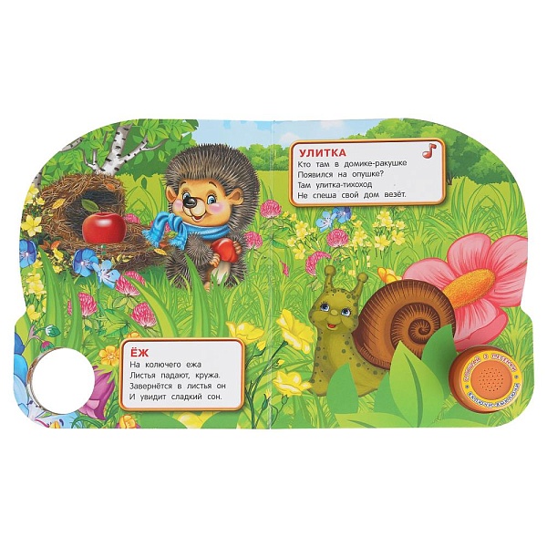 Ребёнок с удовольствием будет листать плотные страницы, рассматривать яркие картинки, вместе с родителями читать добрые стихи про животных и слушать мелодичные песенки, знакомясь таким образом с окружающим миром. Малыш легко освоит включение звука: по нажатию на кнопку песенка включится, при втором нажатии выключится, при третьем - заиграет следующая композиция и т.д. Благодаря компактному размеру книгу удобно взять с собой в дорогу.
