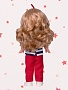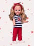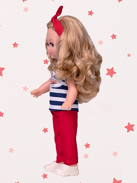 В комплект одежды входит: футболка в полоску с наклейкой «кеда» и брючки. Голову украшает ободок-бант в тон брюк, на ногах кроссовки.