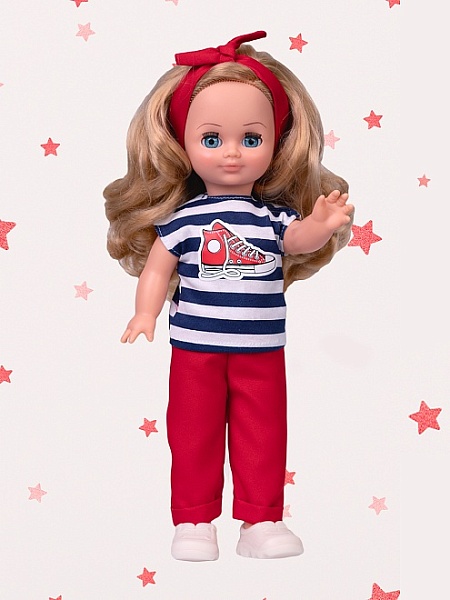 Элементы кукольной одежды, которые легко снимаются и надеваются, разнообразят возможности сюжетно-ролевых игр, в процессе которых развивается мелкая моторика и творческое воображение ребёнка. кукла озвучена. При нажатии на звуковое устройство, вставленное в спинку, кукла произносит фразы. Список звуковых фраз может варьироваться.