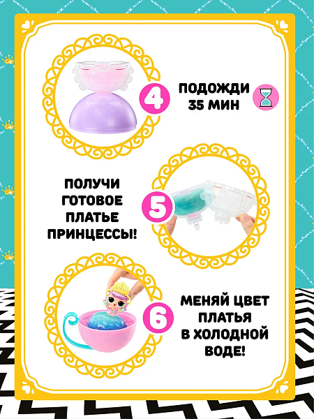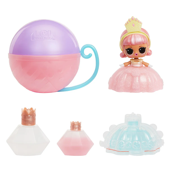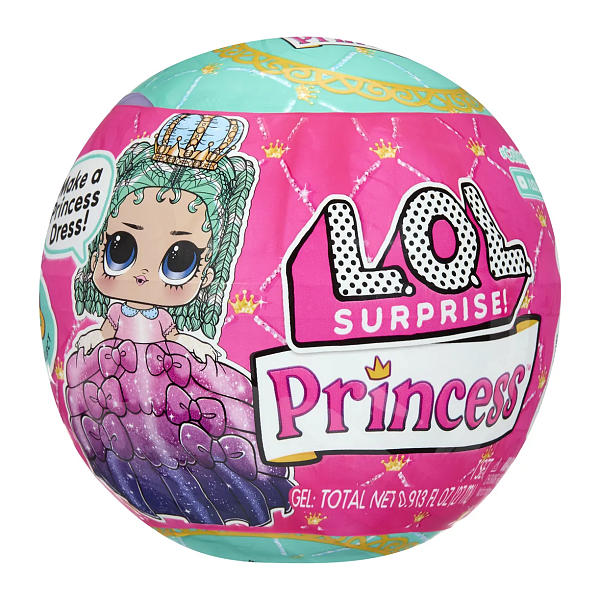 В игровой набор ЛОЛ CЮРПРАЙЗ Кукла в шаре Принцессы входят мини-кукла, предмет одежды, аксессуар, 2 бутылочки с гелем и форма для создания юбки, шар-контейнер и ручка для шара-контейнера.