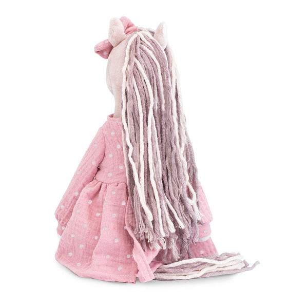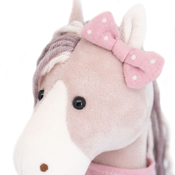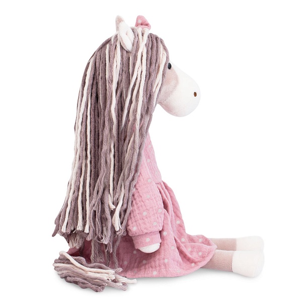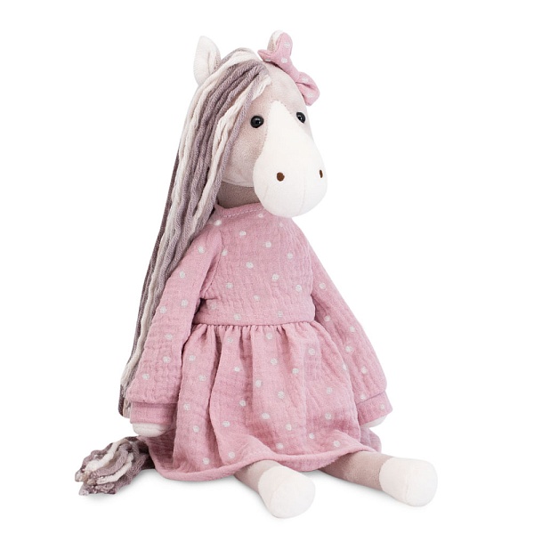 Кто сказал, что Лошадь-символ 2026 должна носить удила и сбрую? Утонченная Софи обожает платья в горошек, розовый цвет и бантики, а гармоничные оттенки ее буйной шевелюры подбирала целая бригада колористов Оранж Тойс. Еще бы пару хрустальных туфелек, и хоть сейчас на бал - покорять принца на белом коне. Можно без принца. Впрочем, мягкие игрушки Лошадь и босой любят, так что пусть конь сам подсуетится.