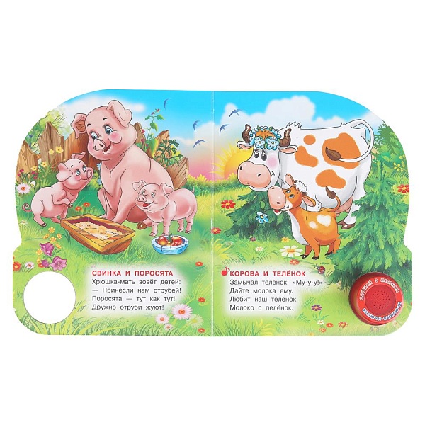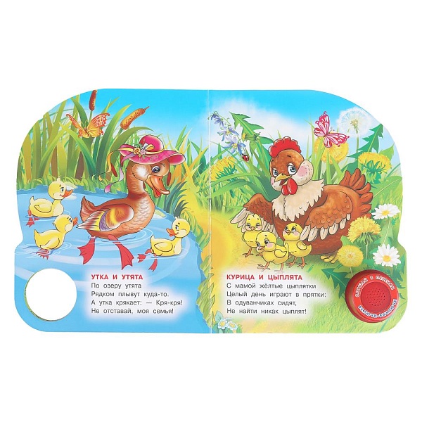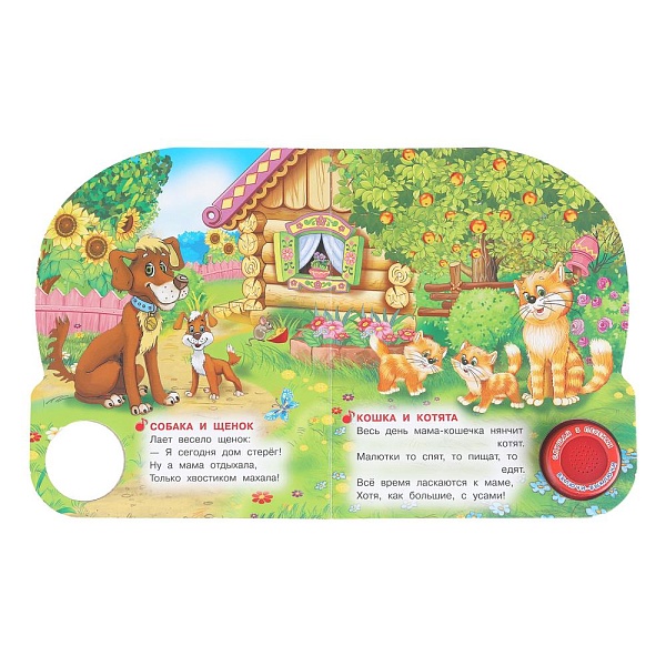 Ребёнок с удовольствием будет листать плотные страницы, рассматривать яркие картинки, вместе с родителями читать добрые стихи про животных и слушать мелодичные песенки, знакомясь таким образом с окружающим миром. Малыш легко освоит включение звука: по нажатию на кнопку песенка включится, при втором нажатии выключится, при третьем - заиграет следующая композиция и т.д. Благодаря компактному размеру книгу удобно взять с собой в дорогу.