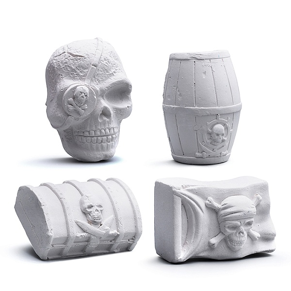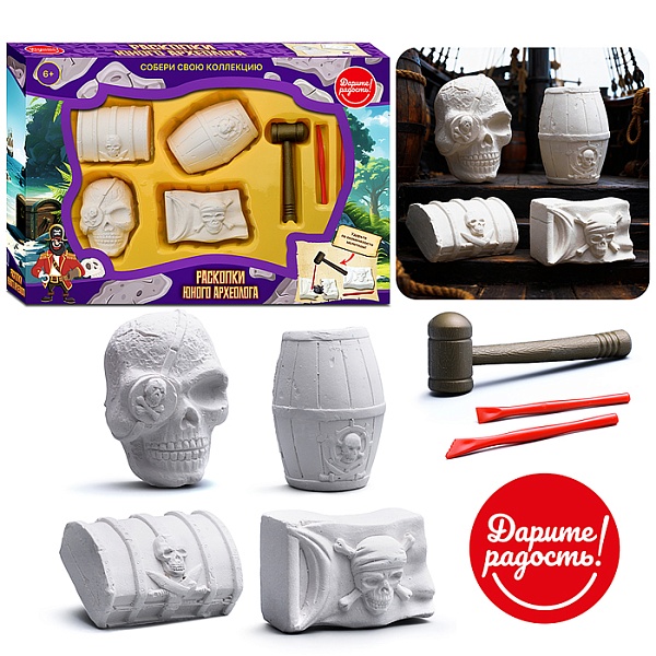 В наборе: долото, молоток, 4 гипсовых объекта с кладом внутри.