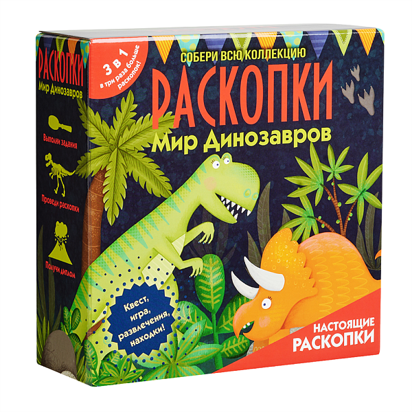 Как только ребёнок откроет буклет с квестом из этого археологического набора, он сразу же отправится в увлекательное приключение по миру динозавров. Юному палеонтологу предстоит заниматься поиском скелетов динозавров в брусках из гипса. Где же спрятаны очень редкие светящиеся динозавры? Это ещё предстоит узнать! Кроме раскопок путешественник будет исследовать мир динозавров, играя в игру-ходилку, разгадывать таинственные загадки из книги с квестом и раскрашивать открытки, которые можно подарить другим любителям динозавров. В наборе также есть лупа, которая поможет подробно изучить найденных динозавров.