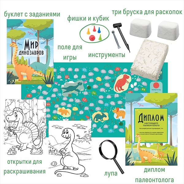 В наборе: буклет с заданиями, настольная игра, кубик, фишки, три бруска для раскопок, инструменты для раскопок, лупа, диплом археолога, открытки-раскраски. Цвета находок в ассортименте.