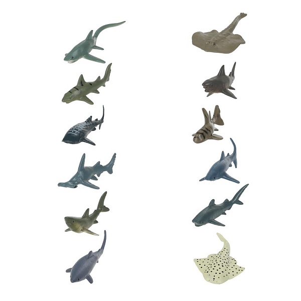 Пластизолевые игрушки серии «Рассказы о животных» – копии реальных рептилий, зверей, птиц и насекомых. Благодаря таким игрушкам можно легко и весело познакомить ребёнка с видами животных, их повадками и особенностями. Пластизолевыми фигурками можно играть на улице и в ванной, они легко моются. В набор «Морские животные» входят: акулы – 8 см, белая акула с пятнами – 7 см.