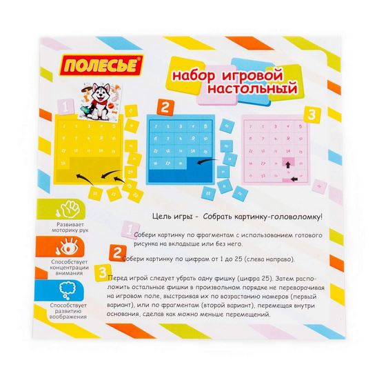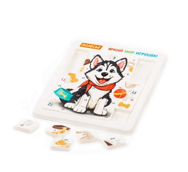 Суть игры заключается в том, чтобы собрать изображение, перемещая фишки. Настольная игра "Щенок" способствует развитию логического мышления, улучшает моторику рук, а также тренирует концентрацию внимания.
