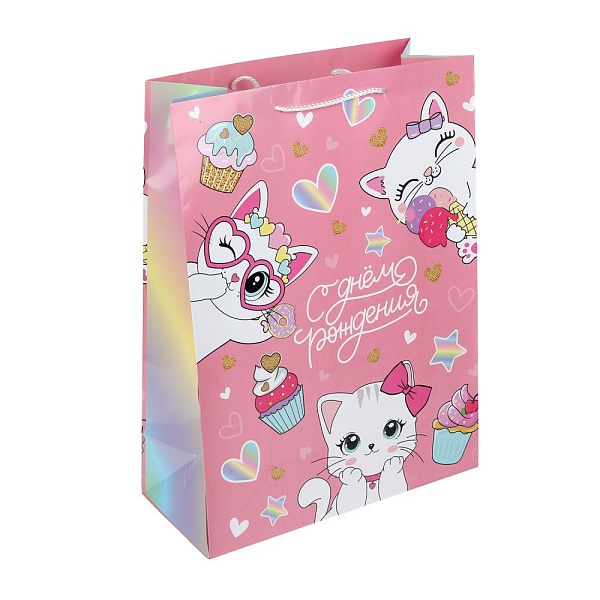 Праздничный подарочный пакет с милыми котиками станет ярким запоминающимся штрихом, изюминкой подарка, и принесёт виновнику торжества радость предвкушения. Ему будет интересно заглянуть в него, чтобы узнать, что же приготовили родные или друзья на день рождения.