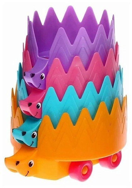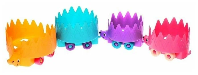 - Ёжики имеют колесики и крепления, благодаря которым легко соединяются между собой, превращаясь из пирамидки в вагончики.