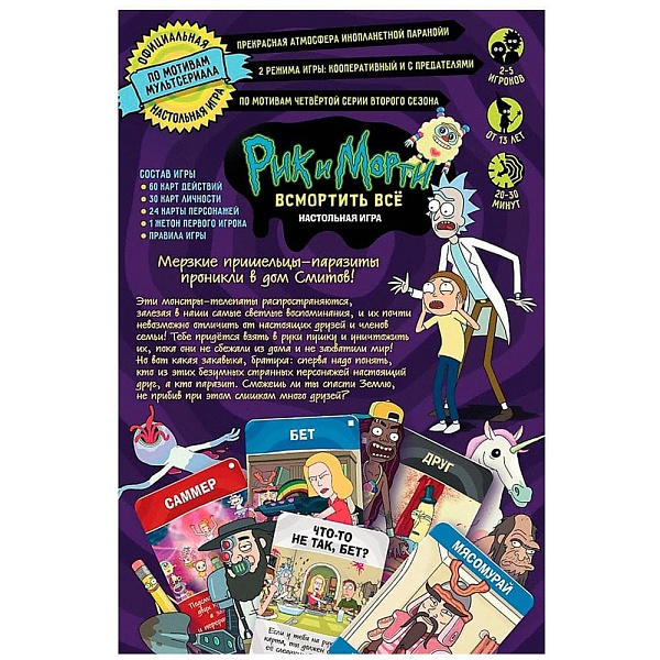 "Рик и Морти: Всмортить всё" – это настольная игра, созданная по мотивам нашумевшего мультипликационного сериала "Рик и Морти", который бросил вызов общественности своим цинизмом и чёрным юмором. Говоря ещё конкретнее, карточная игра создана по мотивам четвёртой серии второго сезона, где герои оказываются взаперти с паразитами, принявшими облик друзей и членов семьи… И внедривших всем положительные воспоминания о себе! Ваша задача – вычислить и уничтожить всю инопланетную заразу. Желательно, не уничтожив при этом слишком много друзей!
