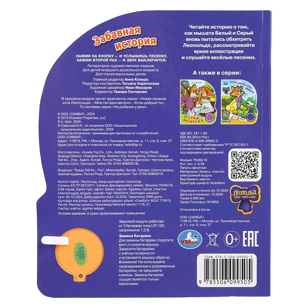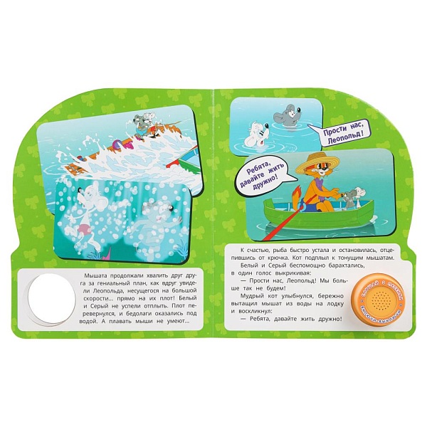 Ребёнок с удовольствием будет листать плотные страницы, рассматривать красочные картинки, вместе с родителями читать увлекательную историю про приключения кота Леопольда и двух мышек-хулиганов и слушать весёлые песенки из мультика. Малыш легко освоит включение звука: по нажатию на кнопку песенка включится, при втором нажатии выключится, при третьем - заиграет следующая композиция и т.д. Благодаря компактному размеру книгу удобно взять с собой в дорогу.