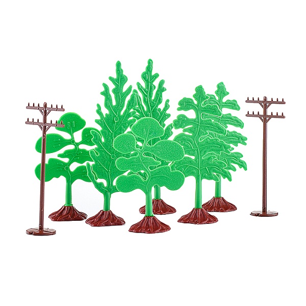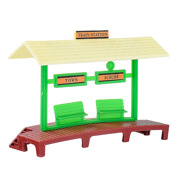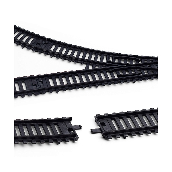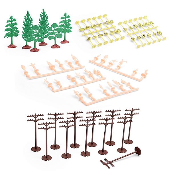 В комплекте 101 деталь – локомотив, вагоны, платформа, изогнутые рельсы, прямые рельсы, стрелка, деревья, основания деревьев, электроопоры, дорожные знаки, фигурки людей.
