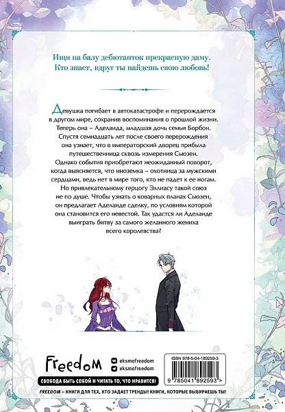 Девушка погибает в автокатастрофе и перерождается в другом мире, сохранив воспоминания о прошлой жизни. Теперь она — Аделаида, младшая дочь семьи Борбон. Спустя семнадцать лет после своего перерождения девушка узнает, что в императорский дворец прибыла путешественница сквозь измерения Сьюзен. Однако события приобретают неожиданный поворот, когда выясняется, что иноземка — охотница за мужскими сердцами, ведь нет в мире того, кто не падет к ее ногам. Но привлекательному герцогу Эллиасу такой союз не по душе. Чтобы узнать о коварных планах Сьюзен, он предлагает Аделаиде сделку, по условиям которой она становится его невестой. Так удастся ли Аделаиде выиграть битву за самого желанного жениха всего королевства?