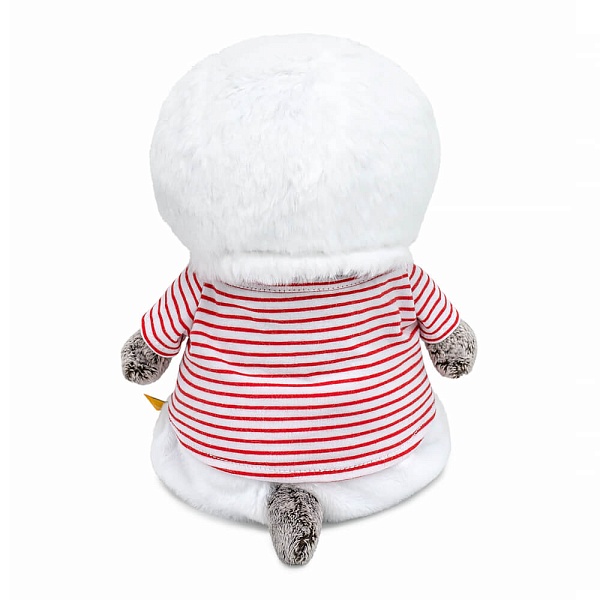Малыш Басик в невероятно трогательном костюмчике Снеговика. На нём объёмная белоснежная шапочка из пушистого меха, с носиком морковкой, вышитыми глазками и улыбкой. Шапочка завязывается на белую ленту с большими помпонами на концах. Также на Басике лонгслив из х/б трикотажа в бело-красную полосочку и белые меховые штанишки на резиночках по низу.