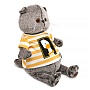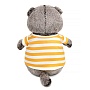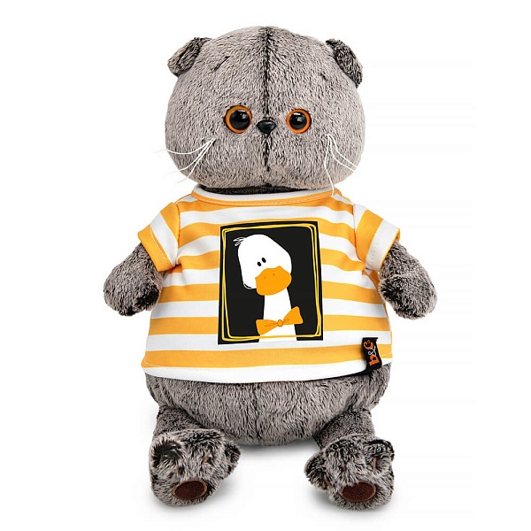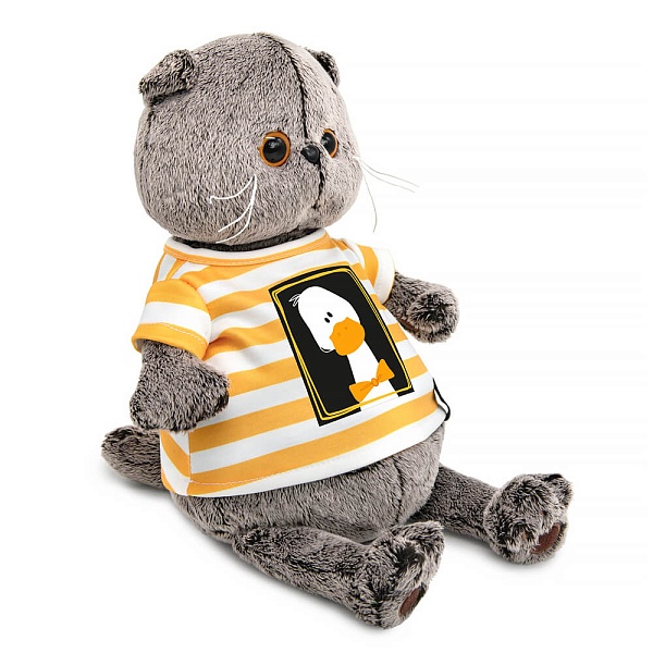 Кот Басик в классной футболке из х/б трикотажа в бело-жёлтую широкую полоску. Спереди на футболке авторский принт с Гусиком.
