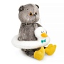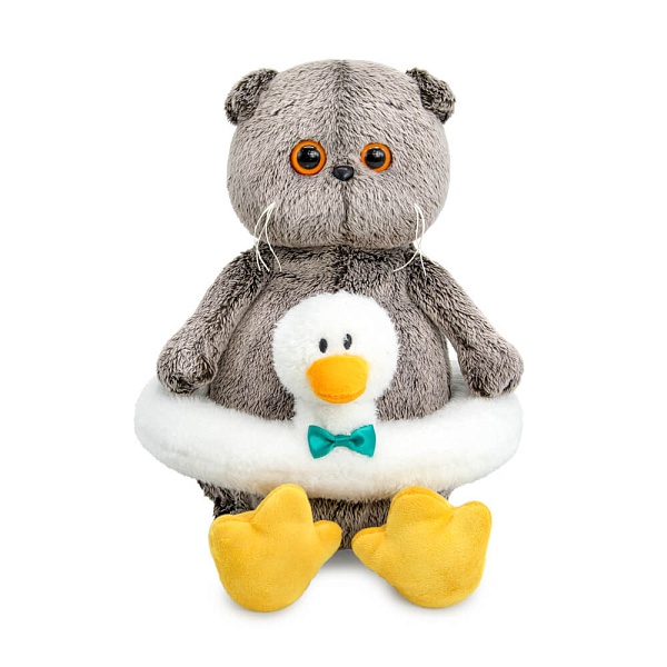Кот Басик в забавном плавательном круге в виде Гусика. Мягкий круг Гусик сшит из тактильно приятного меха с коротким ворсом белого цвета, клювик выполнен из охристого софта. Также на Басике милые тапки в виде лапок гуся из софта охристого цвета.