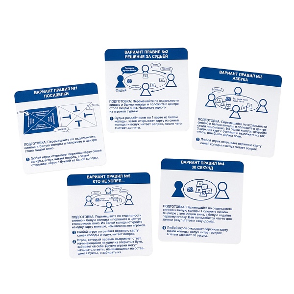 А чтобы играть было ещё интереснее, внутри вы найдёте аж 5 вариантов правил на любой вкус и компанию. Скорее зачитывайте вопрос, открывайте букву, выкрикивайте первое, что приходит на ум, и готовьтесь вместе хохотать от удивления!