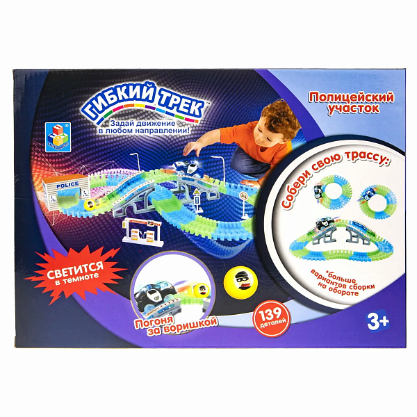 Гибкий трек от 1TOY задает новый тренд традиционной игре с машинками. Набор «Полицейский участок» особенный, ведь элементы дороги светятся в темноте, а у машинки сияют фары. Так интересно в полутьме наблюдать, как по фосфоресцирующей дороге мчится полицейский автомобиль, преследуя воришку. С помощью деталей набора можно придумать множество вариантов трассы, а уж если добавить элементы любого набора серии «Гибкий трек» (кроме "Ночного экспресса"), то игра станет практически бесконечной, ведь все они совместимы друг с другом! Совмещая наборы, можно получить большую дорогу для машинок. Работает от 2 батареек типа АА, не входят в комплект. Трек с машинкой предназначен для детей от 3 лет. Чтобы дорога светилась, ее необходимо подержать под источником света.