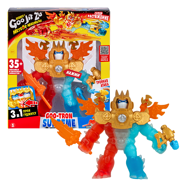 Встречай Непревзойдённого Гу-Трона — самого мощного героя коллекции GooJitZu Метеор Мэднесс! Он объединяет силу трёх легендарных героев: огненного Блейзагота, скрытного Пантаро и неукротимого Траша. Только Гу-Трон способен противостоять разрушительной силе и спасти вселенную Гу от гибели!