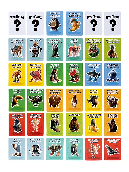 Погрузитесь в мир безудержного веселья с настольной игрой «Ктояжка» Брейнрот. Этот набор вдохновлен узнаваемыми итальянскими животными мемами, которые подарят вам массу удовольствия и смеха. Подготовьтесь к тому, что ваш друг может стать бобрито-бандито, а вы – балерина-капучина и придется выяснить, кем же вы являетесь, задавая наводящие вопросы другим игрокам.
