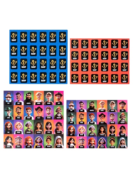 У каждого из вас есть поле с окошками. Вставьте карточки с персонажами (3*3,5 см) в окошки, загадайте одного человека на своем поле и поставьте карточку этого персонажа ( 3*4,5 см) у основания игровой платформы, не показывая другому участнику.
