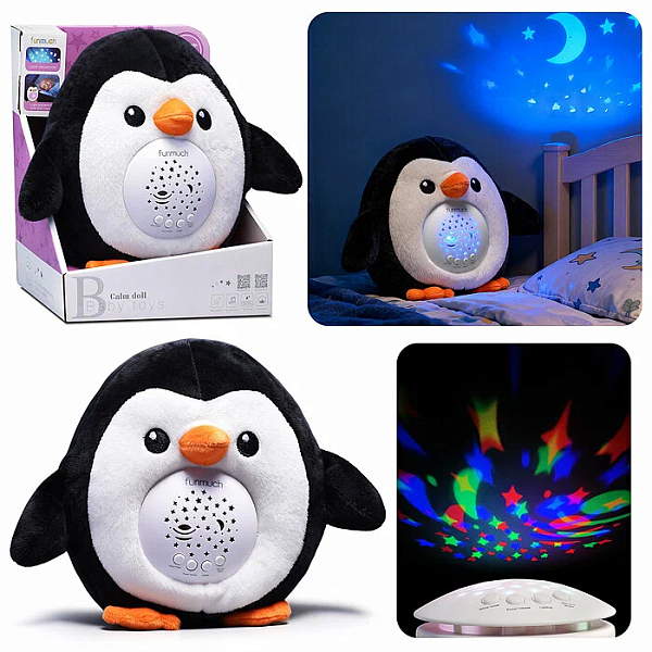 Мягкая музыкальная игрушка с проектором. Имеет световые и звуковые эффекты: воспроизводит 20 приятных мелодий и проекцию ночного звездного неба изменяя 5 цветов света .Игрушка непрерывно работает в течение 20 минут. Можно стирать, предварительно вынув музыкальный блок. Высота игрушки 18 см