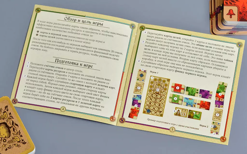 Когда партия начинается, участник получает по две базовые карты, две карты с целями и карту с золотым тиснением. Необходимо выбрать понравившуюся цель, вторую сбросить. На стартовой карте находятся обозначения доступных игроку ресурсов. За один ход нужно разыграть карту, расположив её определённым образом, и взять новую карту из колоды.