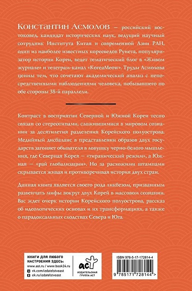 К.В. Асмолов – российский востоковед, кандидат исторических наук, ведущий научный сотрудник Института Китая и современной Азии РАН, один из наиболее известных корееведов Рунета, популяризатор культуры Кореи, ведет тематический блог в "Живом журнале" и телеграм-канал "KoreaMeow". Труды Асмолова ценны тем, что сочетают академический анализ с непосредственными наблюдениями человека, побывавшего по обе стороны 38-й параллели.