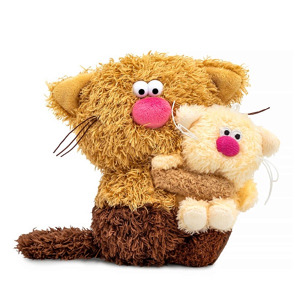 Котик Кортадо трогательно держит в лапках малыша Сливки, сшитого из сливочного эко меха.