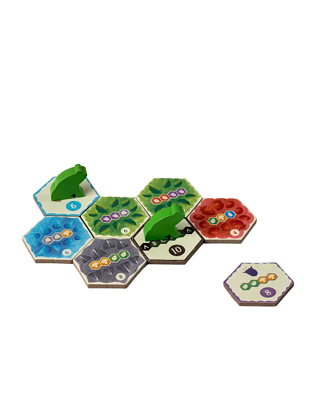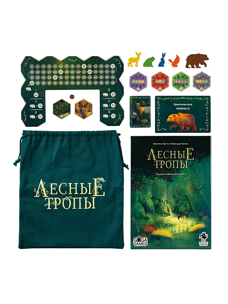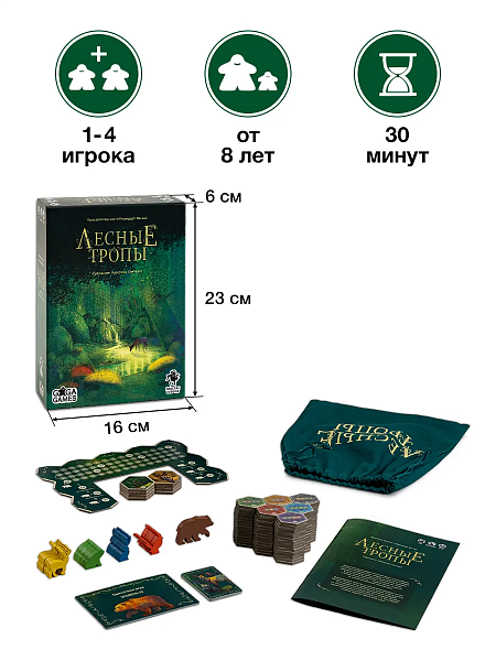 Лесные Тропы – это уютная настольная игра для детей и всей семьи, в ходе которой вы станете обитателями чудесного леса и будете выращивать различные участки с деревьями и растениями, прокладывая по ним хитроумные тропинки и выполняя задания. Каждый тайл в партиях этой семейной настолки вы можете выложить двумя разными способами – как участок леса, расширяя игровое поле ягодами, цветами, грибами, листвой, водой и минералами, или же как задание. Но это еще не все – у каждого задания на прокладывание тропинок есть свои условия по расположению тайлов, поэтому вам предстоит хорошенько подумать на несколько ходов вперед, что и куда стоит разместить, чтобы затем смочь пройти по ним в определенной последовательности. А ведь оппоненты так и норовят раньше вас прибрать к рукам нужные земли с рынка... Чем больше маршрутов вы успеете построить, тем больше победных очков вы получите в конце игры, ну а настоящие мастера лесных приключений способны завершать даже несколько дорожек за раз! Будьте внимательны, ведь даже одна необдуманно выложенная полянка может разделить вашу рощу на части или испортить вам выгодный ход! Также в игре присутствует хороший соло-режим с 6 уровнями сложности, так что даже один игрок сможет насладиться приятным вечером в компании этой коробочки. Будете ли вы истинными хозяевами чащи или же заблудитесь и останетесь позади?