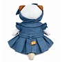 Кошечка Ли-Ли в модном платье из денима синего цвета с серым оттенком. Платье сложного кроя, отрезное по талии, с застёжкой на розовые пуговки, закруглённым воротничком, крылышками и пышной юбкой. Платье сшито с пояском с серебристой пряжкой, продетым в шлёвки. Всё платье отделано контрастной строчкой. На голове у Ли-Ли милый аксессуар в виде ободка-платочка.