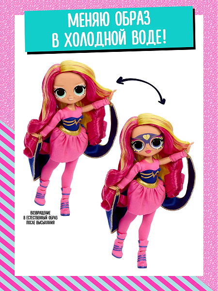 Познакомьтесь с Сабриной Скай — смелой супергероиней! Она носит стильный корсет, дополненный синим топом и ярким плащом, который эффектно развивается при каждом ее шаге и в полете. Ее макияж меняется в холодной воде прямо на глазах!