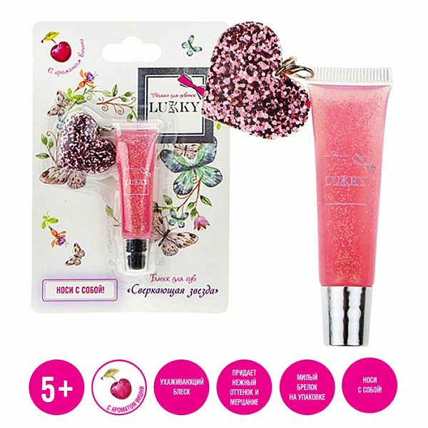 Блеск для губ "Сверкающая звезда" от "LUKKY" не только придает сияние и выразительность губам, но и отлично ухаживает за ними, а еще оставляет приятный аромат вишни. Компактный удобный формат позволяет носить его с собой и использовать по мере необходимости где и когда угодно. А подвеска в виде сердечка точно придется по вкусу юной моднице и поможет быстро найти блеск даже в самой вместительной сумочке. А при желании подвеску можно открепить и повесить куда угодно в качестве модного аксессуара.