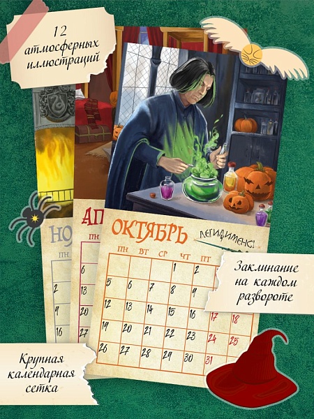 Отправьтесь в путешествие по магической вселенной: Гарри, Рон, Гермиона и другие любимые герои, Хогвартс и его окрестности, уютная Нора перенесут в знаменитую историю о мальчике, который выжил. Уникальные авторские иллюстрации, ждущие на каждом развороте, и магически стильное оформление на целый год погрузят в атмосферу чародейства и волшебства.