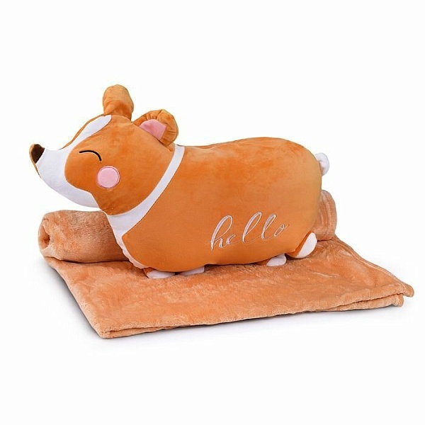 Мягкая игрушка "Корги" с пледом М1220 – Уютный друг для объятий и сна!