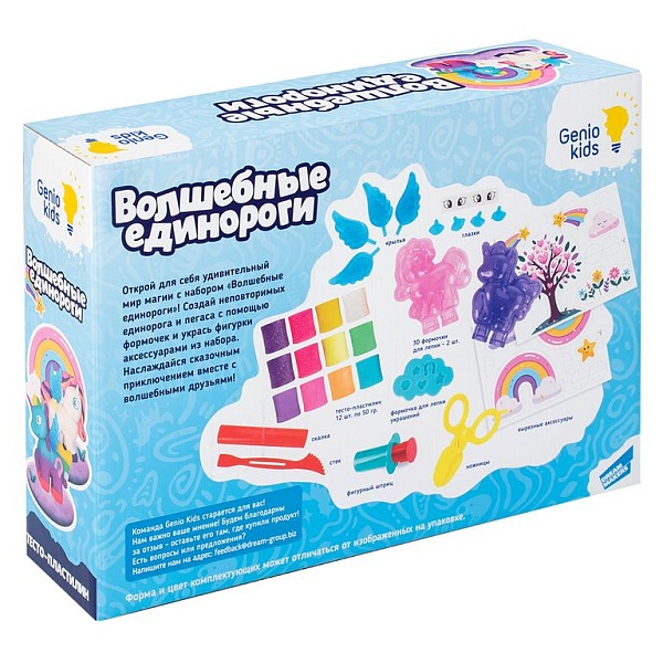 Набор для лепки единорогов из теста-пластилина. Комплектующие из пластика: две двойных формочки единорогов, четыре глаза, четыре крыла, стек, скалка, ножницы, формочка для лепки аксессуаров, шприц-давилка. Два вкладыша. Наклейки с четырьмя глазами. Тесто-пластилин 50гр деление - 12 шт (6 из которых с блестками).