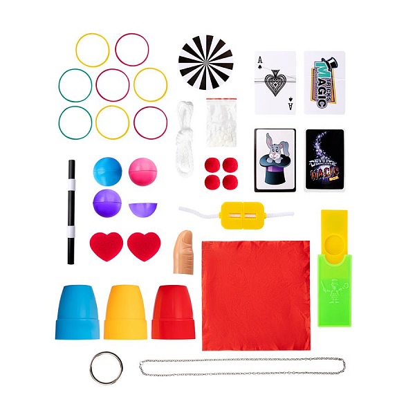 Простой в использовании, он включает все необходимое для начала: волшебный цилиндр, палочку фокусника, стаканы, пластиковые шарики и многое другое.