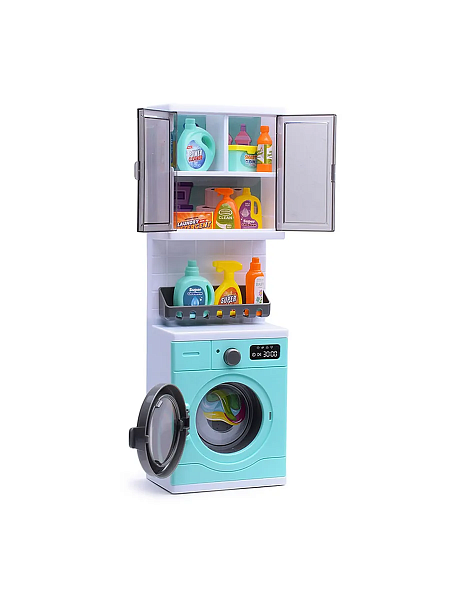 Открывается верхний шкафчик, дверца стиральной машинки, при нажатии кнопки, машинка издает звук и крутится барабан, работает от батареек ( 3шт "АА" в комплект не входит).