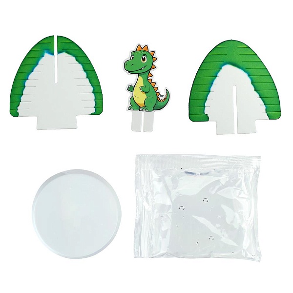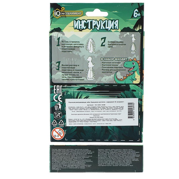 Набор для выращивания кристаллов — это увлекательный способ познакомиться с основами химии и физики, наблюдая за удивительным процессом кристаллизации. Из входящих в состав набора предметов нужно собрать фигурку и установить её в пластиковую подставку. Останется лишь вылить в подставку специальный раствор и подождать несколько часов: конструкция начнёт обрастать кристалликами, а через 24 часа закристаллизуется по максимуму, превратившись в волшебную инсталляцию, верхушку которой будет украшать картонная фигурка забавного динозаврика.